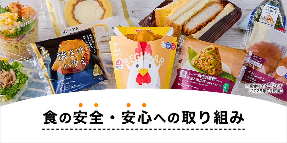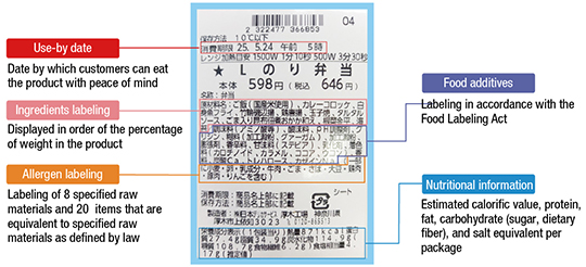 Lawson displays information on its original products by attaching labels that indicate the product name, use-by date, ingredients, etc. Other than the eight specific raw ingredients that are required to be listed as allergens, Lawson also voluntarily indicates 20 other items that are equivalent to these specific raw ingredients so that small children and people with allergies can eat products with peace of mind. The contents of the labeling are strictly checked by the quality control department, as well as by third parties and at the manufacturing stage, in a double and triple check system.