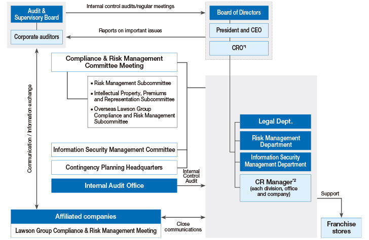 The business of Lawson Group encompasses a wide-range of operations, from the core business of convenience stores to high-end supermarkets and entertainment-related business, to financial, e-commerce, and consulting services. We operate a large number of LAWSON stores, covering every prefecture in Japan and several markets overseas, each of which offers a wide variety of products and services. As such, we are not only required to observe various laws and regulations but also we should assess the diverse range of possible risks and implement the appropriate countermeasures. In light of these characteristics, Lawson has established the “Basic Policy for Regarding the Internal Control System” to achieve healthy, sustainable growth. We are promoting maintenance of our internal control system based on this policy, while responding to changes in our management environment, conducting periodical reviews of the policy itself, and endeavoring to maintain and enhance an effective, practical internal control system.